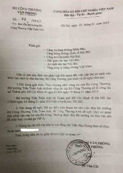Ngày 5/1 đại diện Cảng vụ Hàng không miền Bắc vội vàng đưa ra công văn của Văn phòng Bộ Công Thương ký ngày 3/1 về việc đón tiễn Bộ trưởng Trần Tuấn Anh. Theo công văn, Bộ trưởng Trần Tuấn Anh và đoàn công tác của Bộ Công Thương sẽ đi công tác tại TP.HCM từ ngày 3-4/1/2019.
